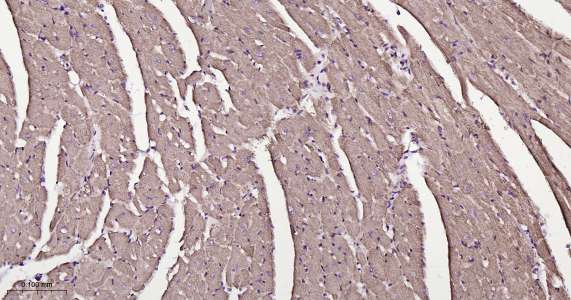Immunohistochemical analysis of paraffin embedded mouse heart tissue slide using IHC0418M (Mouse ATP5A IHC Kit).
