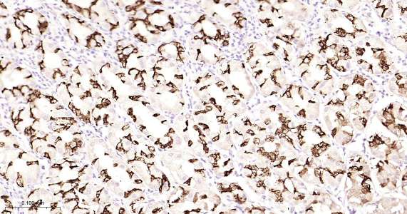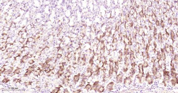 Immunohistochemical analysis of paraffin embedded mouse stomach tissue slide using IHC0463 (AGR2 IHC Kit).