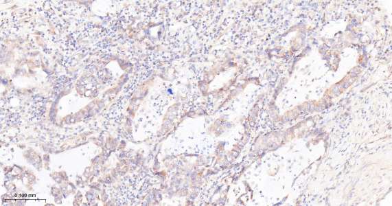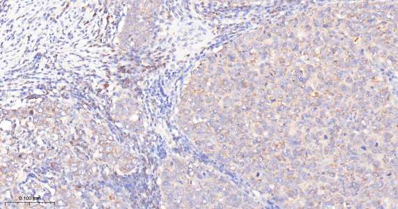 Immunohistochemical analysis of paraffin embedded human breast cancer tissue slide using IHC0476H (Human mTOR IHC Kit).