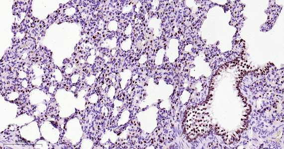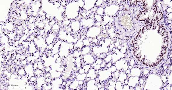 Immunohistochemical analysis of paraffin embedded mouse lung tissue slide using IHC0477 (TTF1/NKX2-1 IHC Kit).