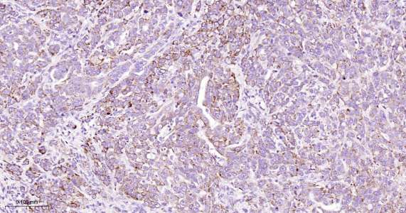 Immunohistochemical analysis of paraffin embedded human ovarian cancer tissue slide using IHC0491H (Human CPT1A IHC Kit).
