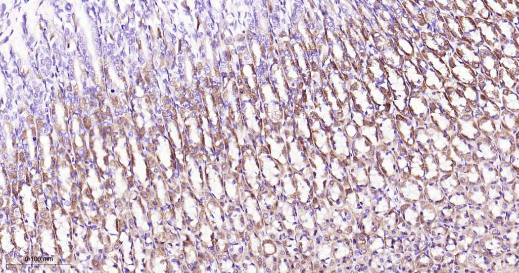 Immunohistochemical analysis of paraffin embedded Rat stomach tissue slide using IHC0624 (ACADM Kit).