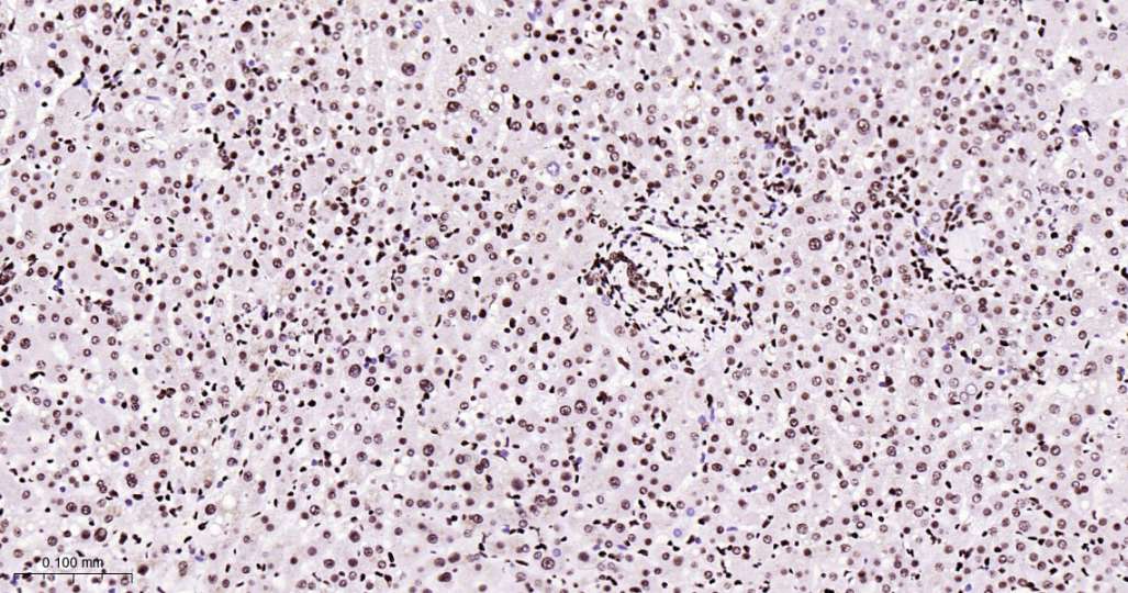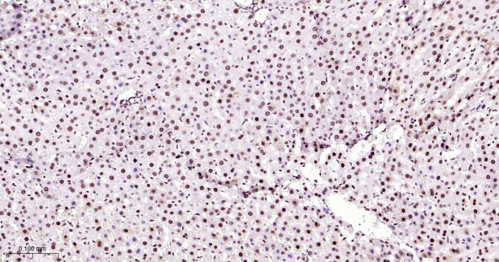 Immunohistochemical analysis of paraffin embedded Mouse liver tissue slide using IHC0665 (Nucleolin Kit).